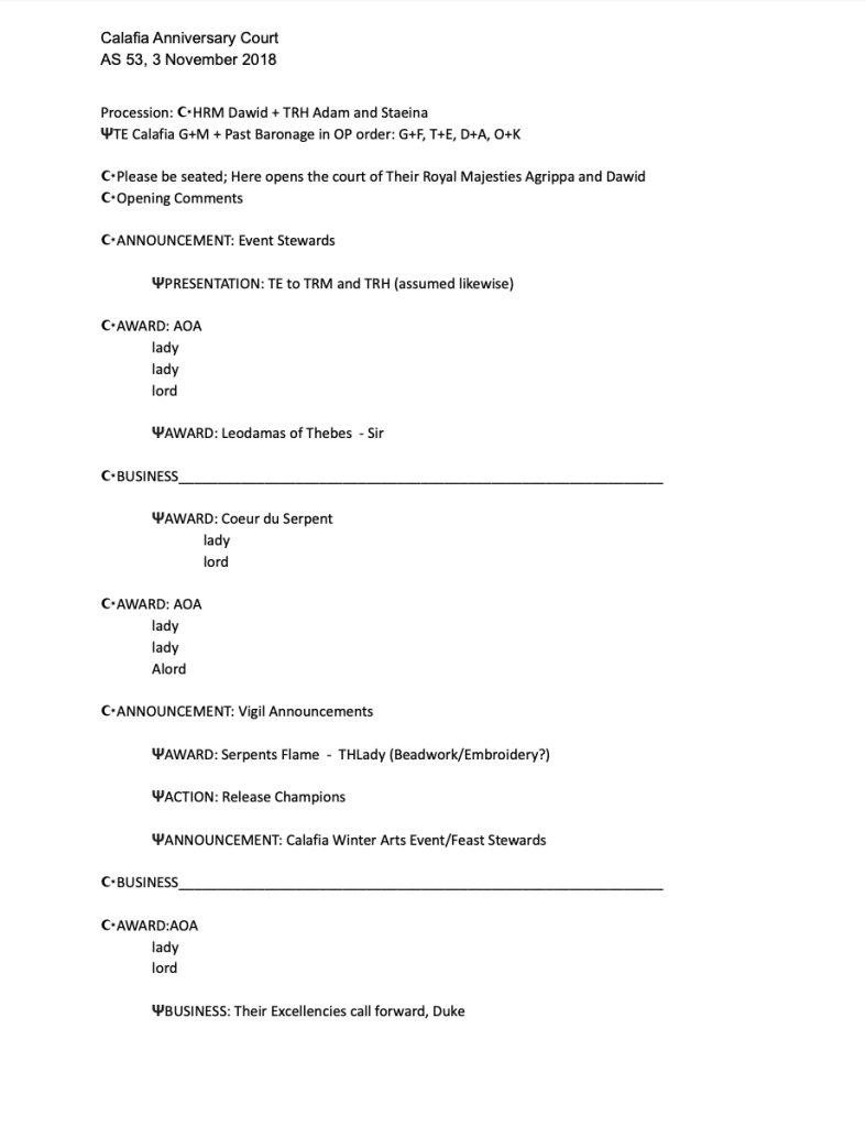 Example Two: a complex, multi-herald court. This court included Royals and sitting Baronage, including all past Baronage of this territory, on the dais. One herald (Trident) has their business marked with a Greek Psi, the other (Crescent) is marked with a crescent moon to help keep track of which herald was in charge of presenting each item. The heralds in this court also helped track which herald was presenting by using an indentation – all Royal business started at the edge, all baronial was indented by one tab space. This is a great example of diversifying business, both through the types of business, and also the herald presenting each item. Again, the recipients’ names were removed for publication.