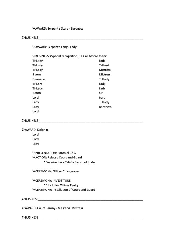 - Staging items – Items of business that fall into this category are mostly “stage directions”, and would include Processionals, Officiating/Closing the court, Litanies, releasing the populace, and the like. These items are not always for public consumption, but rather to keep the herald(s) on track or segueing through items of business otherwise lacking a transition.