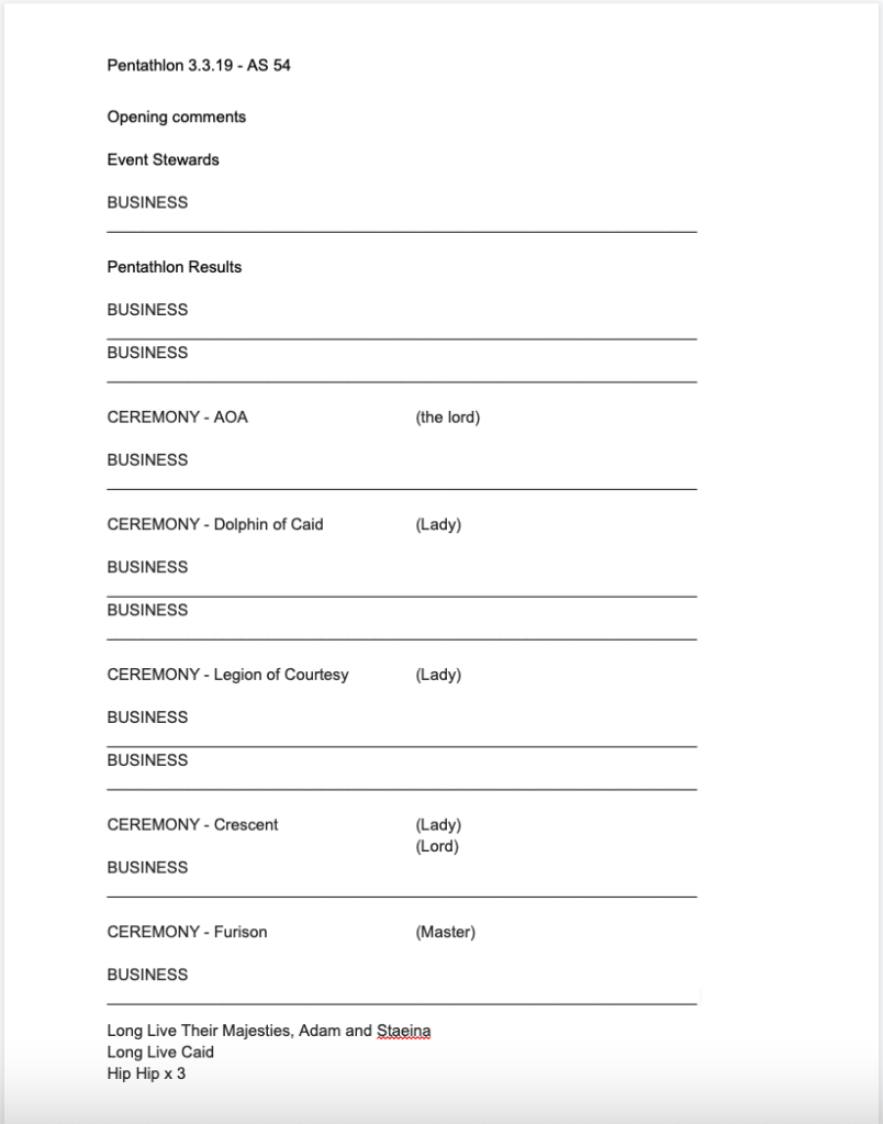 Ultimately, the goal of the Docket is organization. The more complex a court gets, the harder it can be to track all items of business without some sort of system. This is where the Docket shines. It is a visual timeline that all heralds can easily follow and execute. It is important to note that the docket itself can come in many different forms – some herald prefer an outline or spreadsheet, some prefer index cards or post it notes, some have other unique methods. No matter the preference, the system should allow for easy interpretation and execution for all parties, that can then be arranged to personal preference.