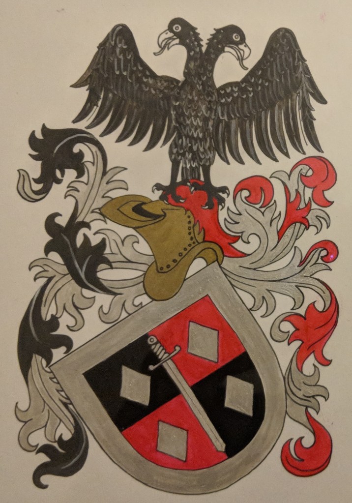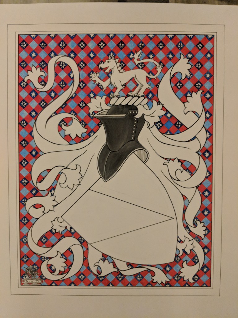 Heraldic achievement for Cormac Mór. Gouache and ink on paper. 2014