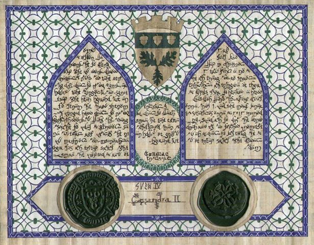 County scroll created for Eilidh na Tire Dharigh. Gouache and ink on papyrus, done in a middle eastern style. Calligraphy done in faux-arabic by Master Thomas Brownwell. 2013