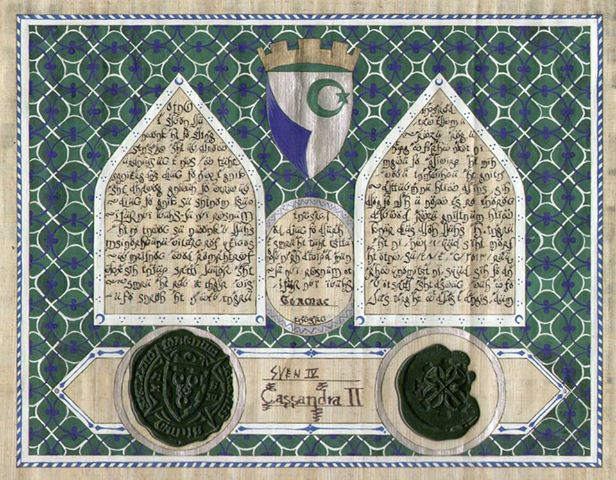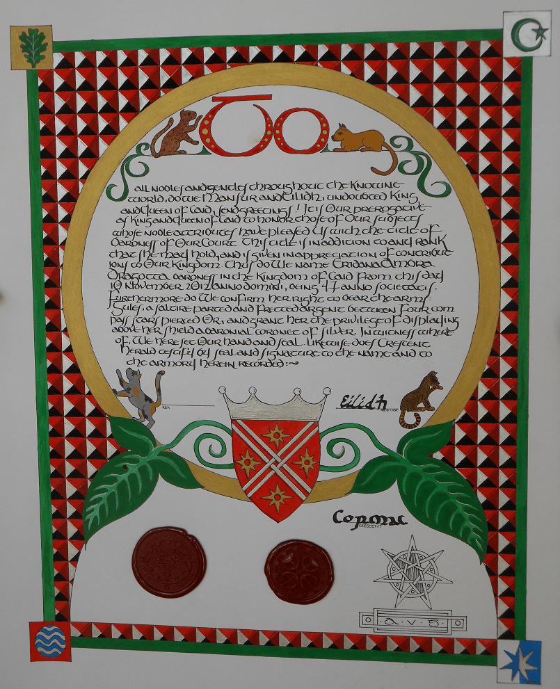 Court Barony scroll for Eridana Ambra Dragotta. Gouache and ink on paper. 2013