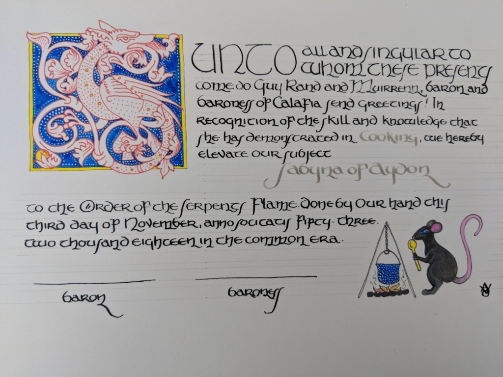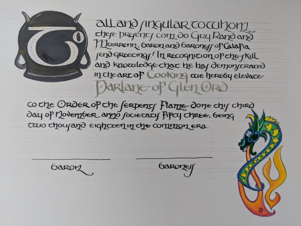 Serpent’s Flame (Calafia Baronial award) scroll for Parlane of Glen Ord. Gouache and Ink on paper. 2018