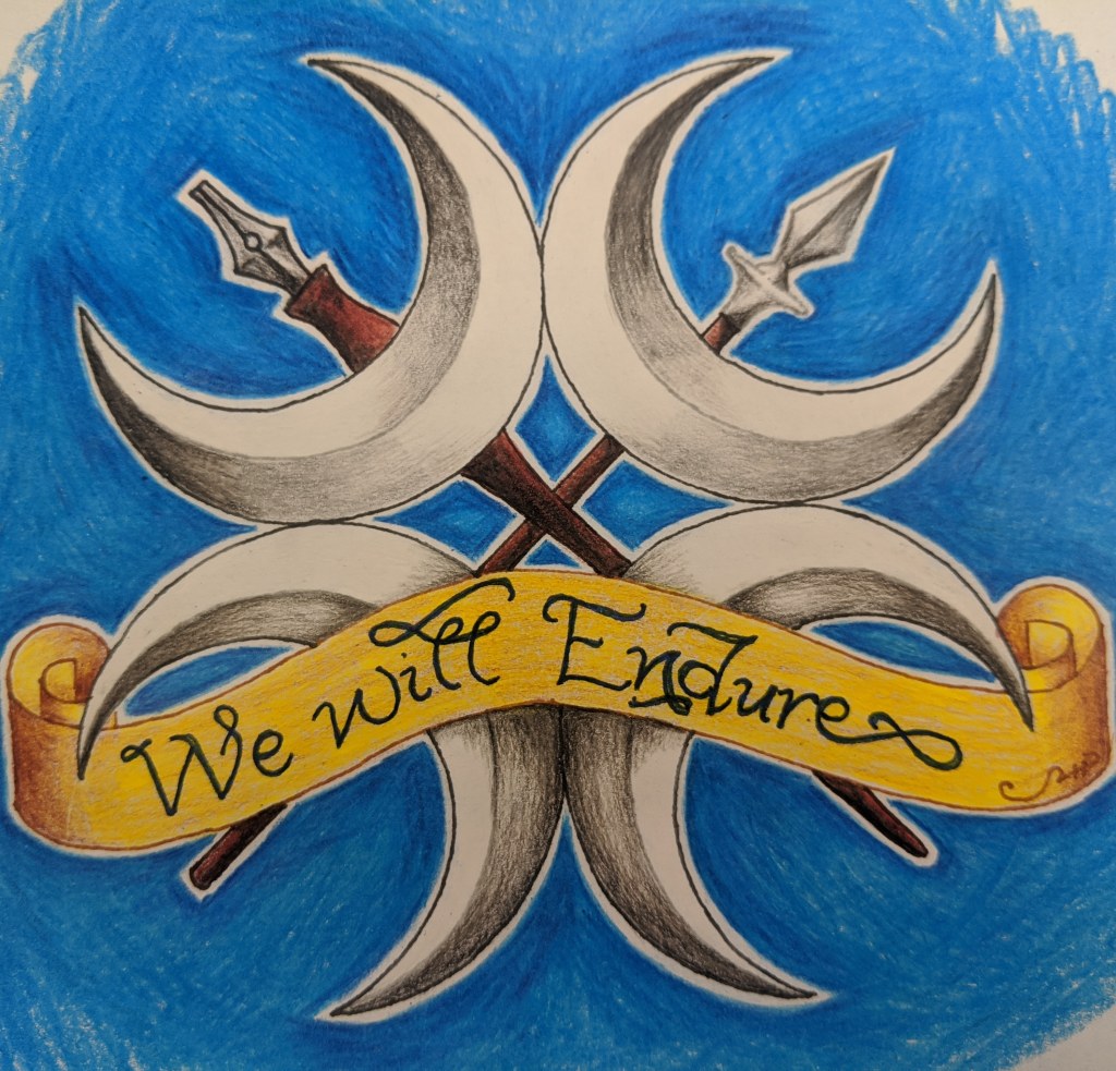 Created during the Year of the Pandemic as an inspirational piece for the Populace. Also appeared on the cover of the May 2020 covers of the “Crown Prints” and the “Caidan Chronicles”. Done in the style of Konstantia Kaloethina. Ink and colored pencil on paper. 2020